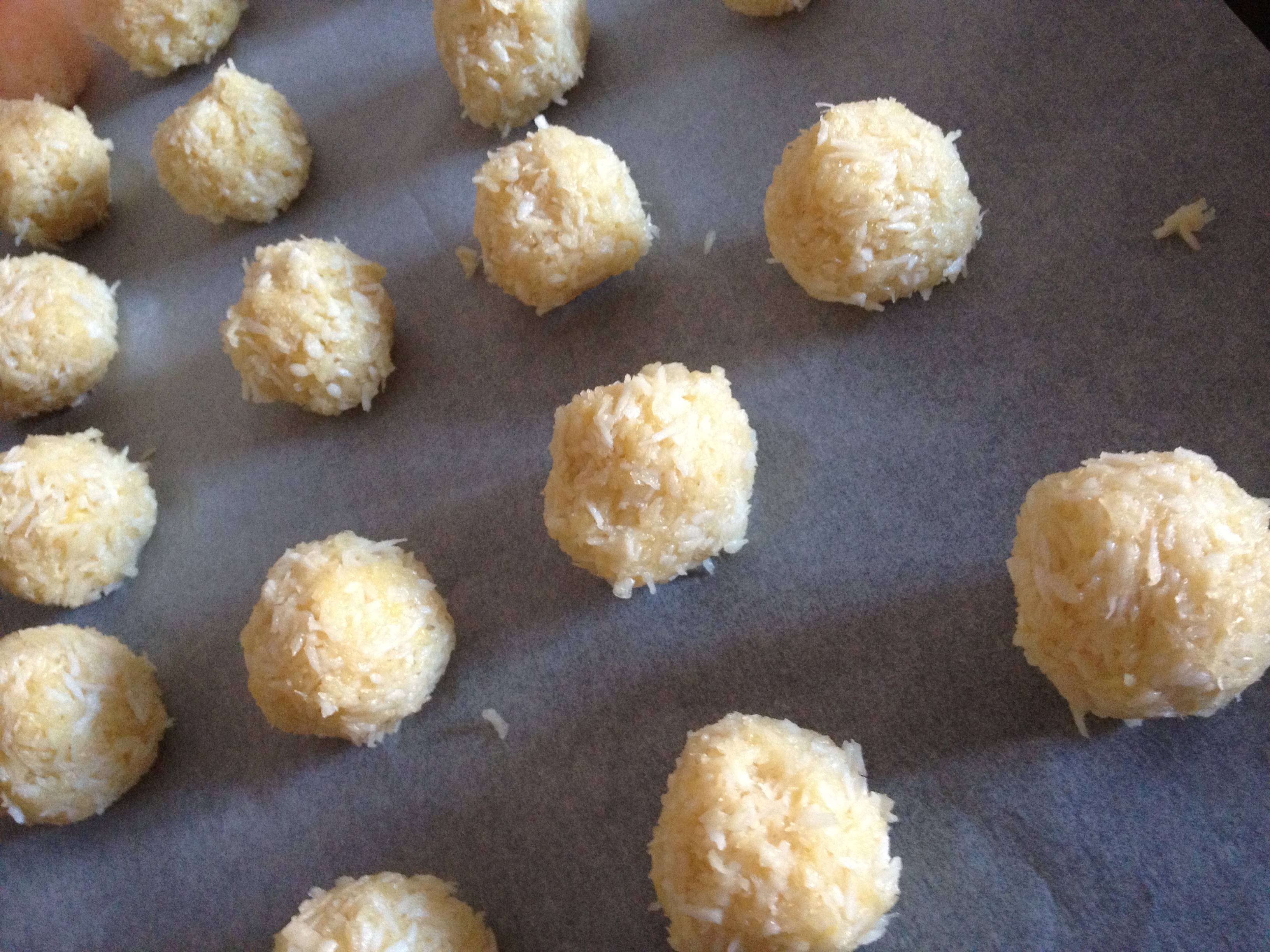 Mescolate tutto insieme (ho letto che c’è chi sbatte gli albumi a neve a parte, potete farlo se vi va). Formate delle palline uniformi e mettetele su una teglia.